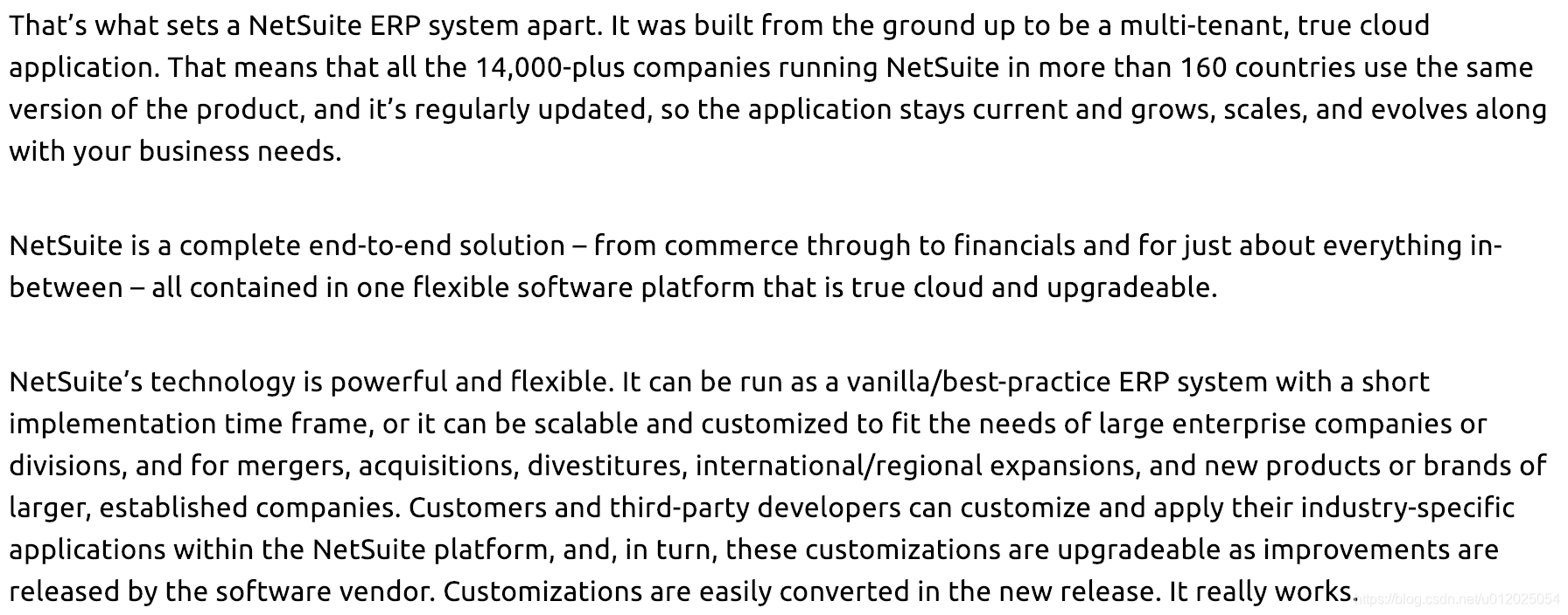 发现由英文翻译到中文真的不是那么简单。翻译过程中把英文中的妙处都体现不出来。大家可以看看原来的句子是如何描述 NetSuite 的。