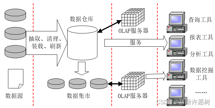 - 数据分析采用【联机分析处理】和【数据挖掘】技术