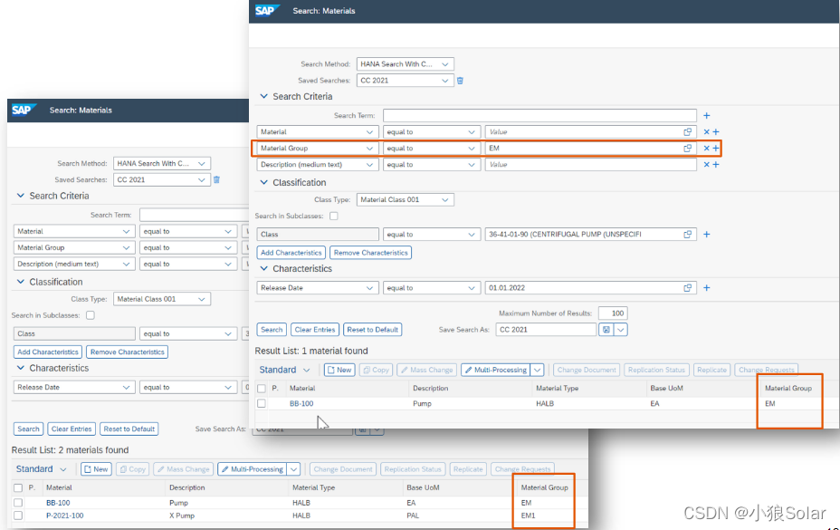 MDG调整了HANA搜索中,“等于”操作符的搜索阈值现在被设置为1.0,即现在“等于”操作符的搜索结果是精确搜索,而不是像以前版本中,“等于”的结果类似于“包含”。下图中左侧是调整前的搜索结果,右侧为新的“等于”搜索结果。