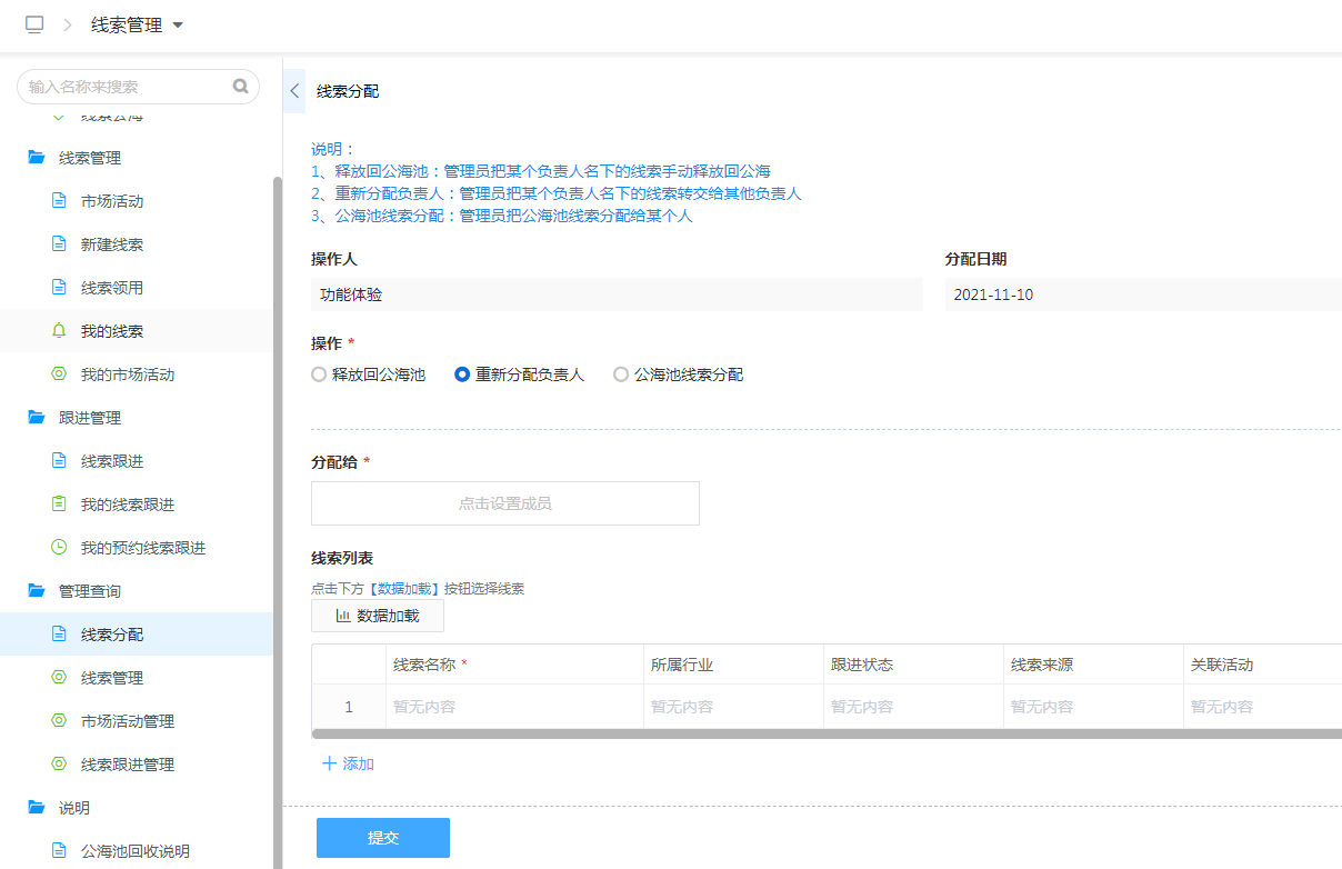 点击管理查询-线索分配,管理员可以对线索进行派送,指定不同员工进行跟进。