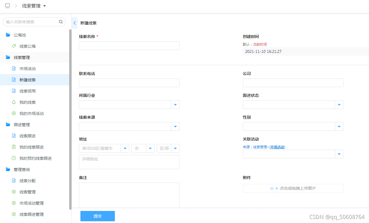 点击线索管理-新建线索,可以详细记录客户的线索,以及分配给相关人员。