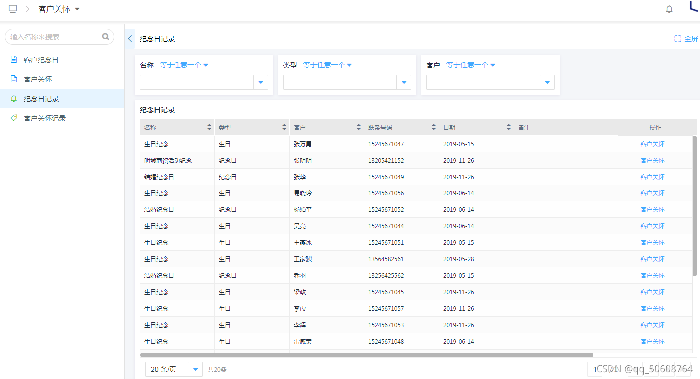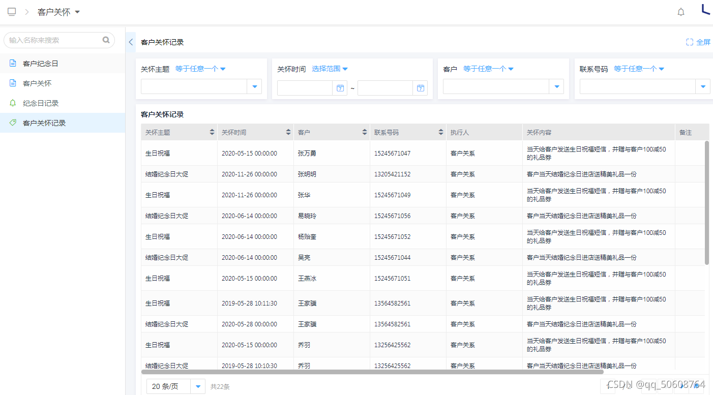 点击纪念日记录,可以看到所有的用户的纪念日,支持按各个条件进行筛选,点击一键关怀,可以自定义给用户发送短信消息,进行关怀,提升用户对您公司的满意度。