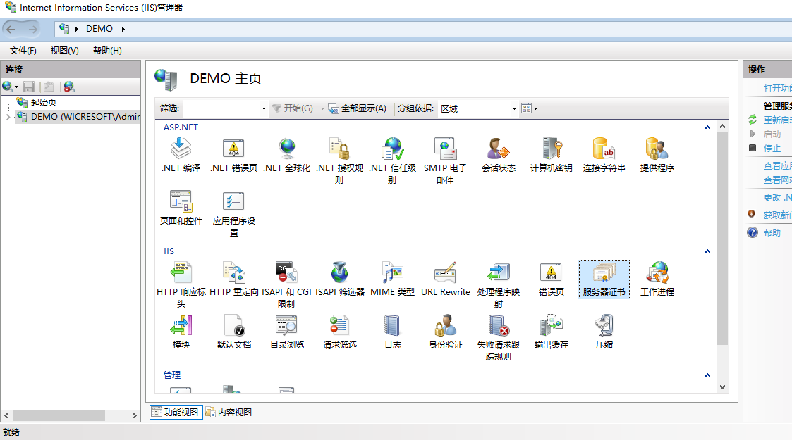 (32)然后在左边展开网站节点,选中 Default Web Site,在右边的操作点击 绑定,在弹出的网站绑定对话框中点击 添加 按钮,在继续弹出的 添加网站绑定 中设定如下图,类型要选择 https,端口保持默认443不变,SSL 证书选择我们前面制作的证书,然后点击确定按钮关闭这两个弹出窗口。