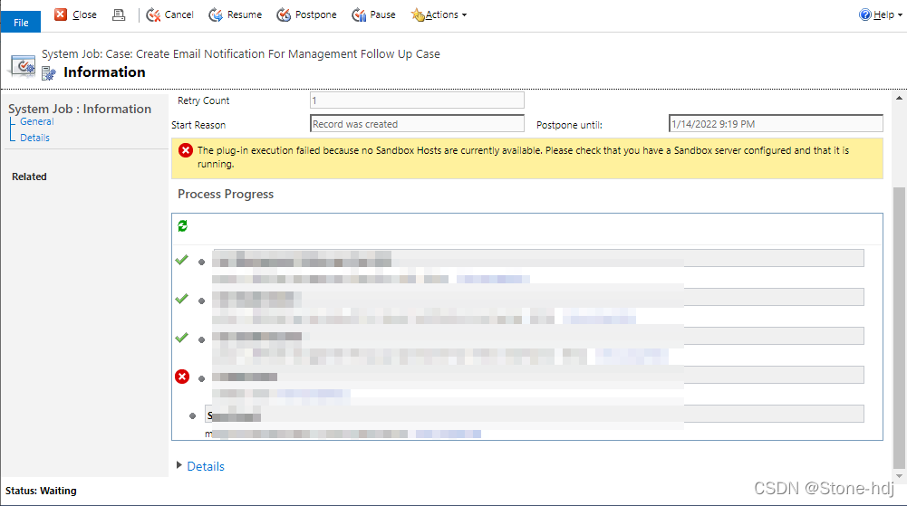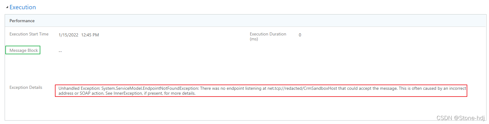 | 异步Async |   插件可以正常运行,没有受到影响,但是我在Plug-in Trace Log中找到运行的这条日志, 里面显示: Unhandled Exception: System.ServiceModel.EndpointNotFoundException: There was no endpoint listening at net.tcp://redacted/CrmSandboxHost that could accept the message. This is often caused by an incorrect address or SOAP action. See InnerException, if present, for more details. 并且我在平时记录log的Message Block字段中, 也没有任何log生成,虽然执行成功了.所以我大胆猜测插件往Plug-in Trace Log中记录日志是依赖于sandbox这个服务的