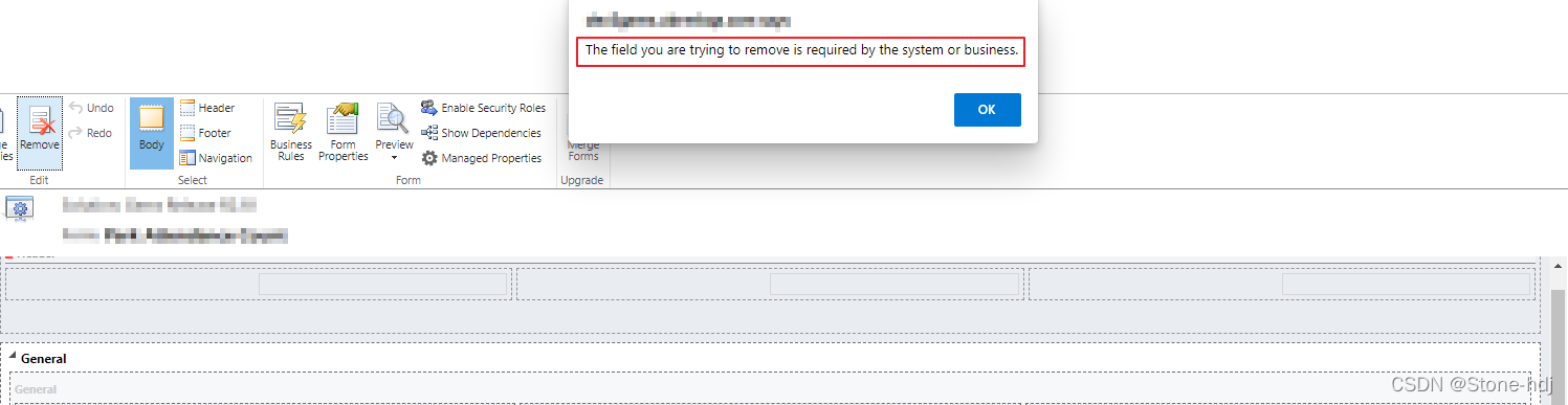但你在一个Form中需要移除一个控件时, 像下面这样提示你"The field you are trying to remove is required by the system or business."