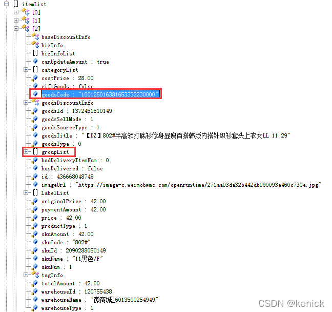 商品中goodsCode为商品中的SPU编码,groupList为分组信息列表(可以在商品中进行设置,订单商品的这里也可以获取到,可用于区分不同平台商品)。