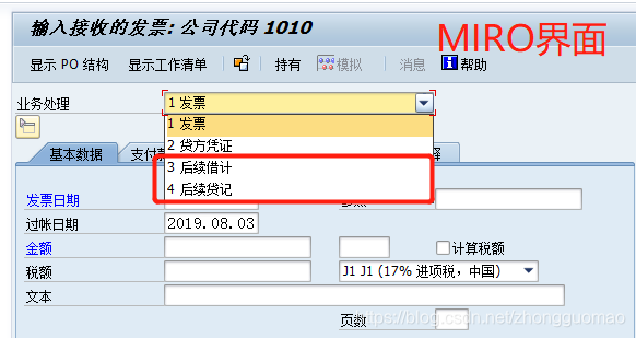 这里所谓的“Subsequent Debits/Credits”就是MIRO发票校验界面中的业务处理类型“后续借记”和“后续贷记”,如下图所示。