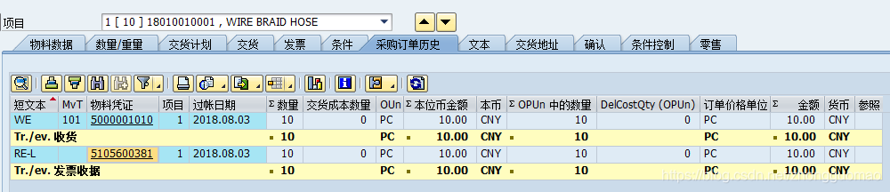 比如有一个PO,数量为10个,收货了10个,发票校验完成了10个,如下图所示: