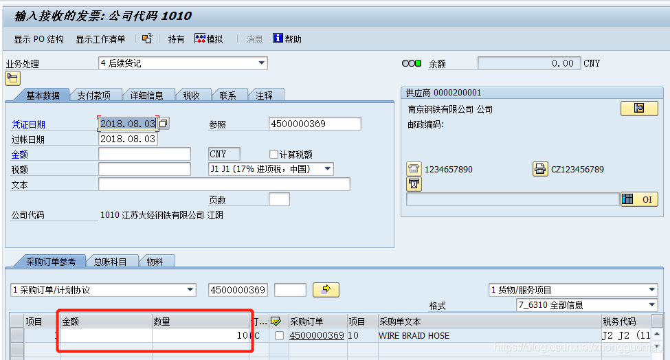注意不管是“后续接记”还是“后续贷记”都需要参照到采购订单,这里的数量则并不是那么重要(当然慎重起见,也需要合理的进行录入,会体现在采购订单历史记录里面),只关注具体金额。