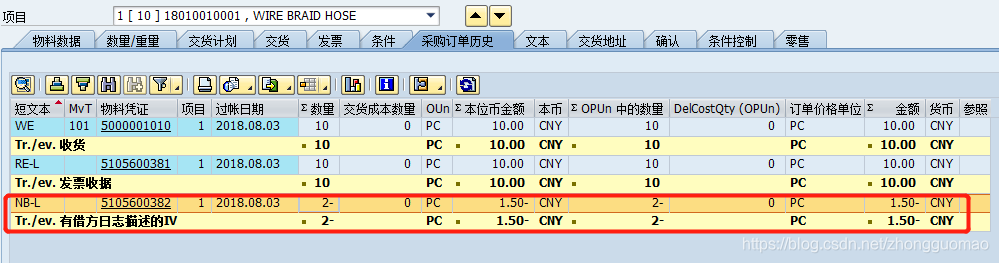 最后我们看一下采购订单历史,也会存在这样的一笔记录。