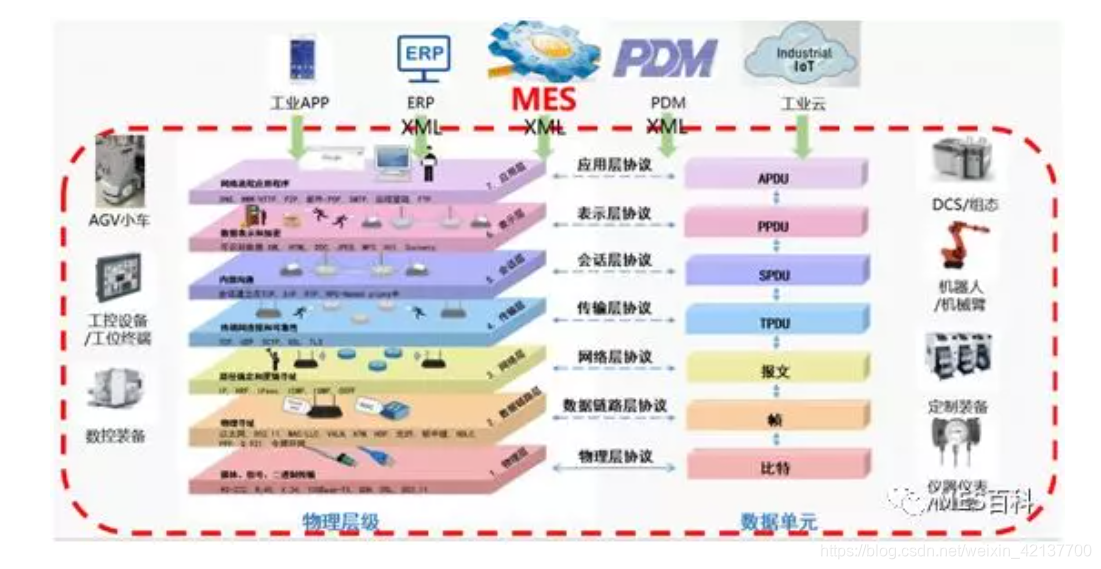 最近工业互联网、工业物联网、工业大数据等概念越来越多的被大家提及,说白了其核心就是让制造执行系统或其他系统去和各种类型的物理设备做虚拟对接,并提取到生产测试数据。类型包括下图所示七个不同物理层的各种设备:仪器仪表、传感器、AGV、机器人、工控设备、数控装备、贴片机、AOI等等。一个好的MES系统不但能够收集这些设备的数据,而且采用的收集方式也是以符合国标要求和国际标准的通用格式为主。在MES选型时请注意考察其数据采集的规范性和可拓展性,而不仅仅是达到暂时的目的。