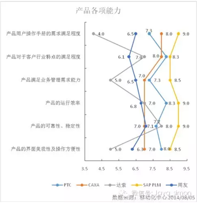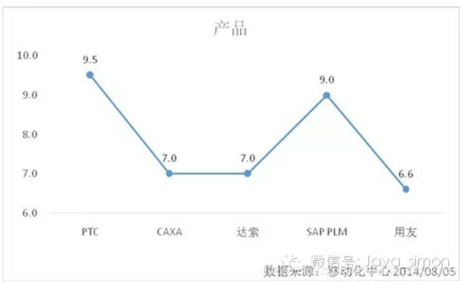 五家厂商的PLM产品各有特色,而移动化研究中心也是遴选了5类产品特点鲜明的厂商做研究对象,国内PLM市场中主要也是这几类产品为主。PTC是以PDM为主的PLM解决方案;达索则在CAD市场中独占鳌头;SAP是形成ERP+PLM的整合解决方案特点的供应商;CAXA是国内最早的基于EAP平台做PLM后逐渐衍生为协作的PLM解决方案;用友最早收购的PLM产品也是在CAD大型3D技术领域有着独到之处,只是后来的产品战略令PLM失去重心,目前处在与ERP结合不畅,CAD平台竞争乏力的困局。