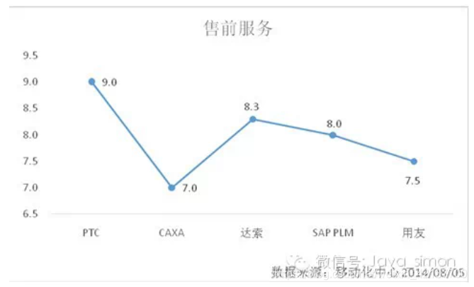 CAXA(卡萨)国内最专业的PLM厂商之一,在售前服务中的表现令人大跌眼镜,售前服务并没有与之强劲的综合实力匹配。卡萨在售前服务的短板和优势一样明显,最大的漏洞尽然是对行业的了解程度,这对于一家国内最专业的PLM和CAD厂商而言是无法被原谅的,可能由于技术背景深厚,在对于销售的培训和甄选上没有那么重视,这导致销售队伍能力的层次不齐,在售前顾问的培训上,CAXA做的还不到位,从用户打出的分数可以看出,对于自身产品介绍最高分其余都很低,说明CAXA顶多只是将销售人员培训成了产品讲解员而非销售顾问,伴随用户的成长已经无法对这样的销售能力感到满意。CAXA在销售环节出现的巨大问题应该引起高层重视,虽然CAXA活得融资,有了玩资本的资格,不过连用友尚且还没有放弃软件业务,CAXA是否应该重新定位一下自身在PLM市场的角色。