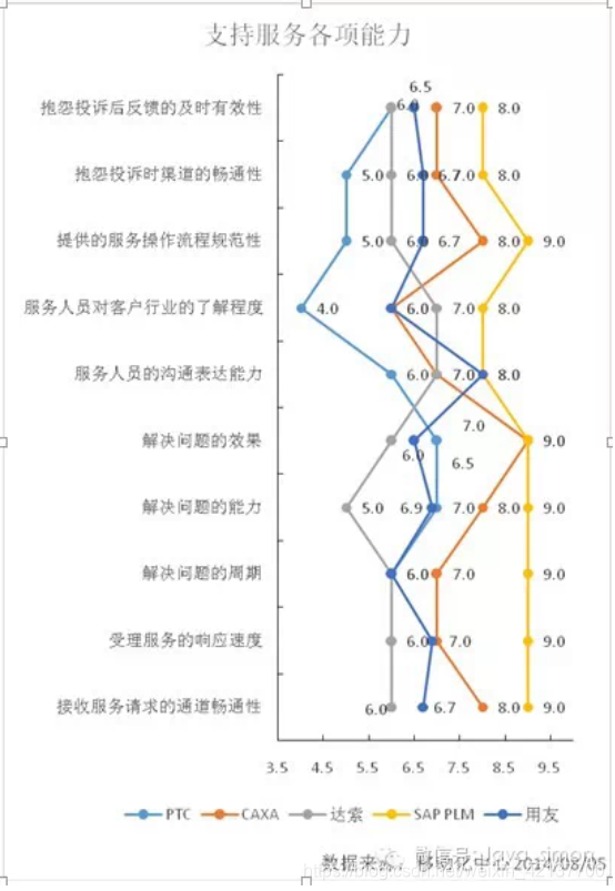 SAP在PLM支持服务上下的功夫已经算是卓有成效。吸取了其ERP、HR等软件的教训,在潜力巨大的PLM市场中,SAP对于中国用户关注的支持服务能力都做了特别强化,在各项能力上的表现都达到了超一流标准。当然这也是由于SAP PLM国内用户不多,能给到这么好的服务,如果其市场规模增大,不知是否还能有如此优异的表现,需要时间的检验。
