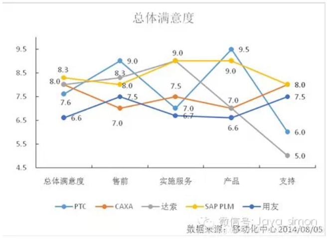 从图表中可以看到,五大PLM厂商在整体满意度中的表现除了用友明显落后以外,其余几家厂商的竞争较为激烈,国际品牌的各项能力相比国产品牌都比较突出。其中SAP以及达索的高稳定性非常值得友商学习,PTC在PLM领域的传统豪门,表现不够稳定,但也远胜国内品牌;国产品牌的CAXA虽然与国际大牌有一定差距,但也有值得称道的稳健表现,逐渐有赶上国际品牌的趋势,而用友则显得各项能力上都比第一集团明显落后,刚过及格线的分数堪堪达到一线厂商的门槛。